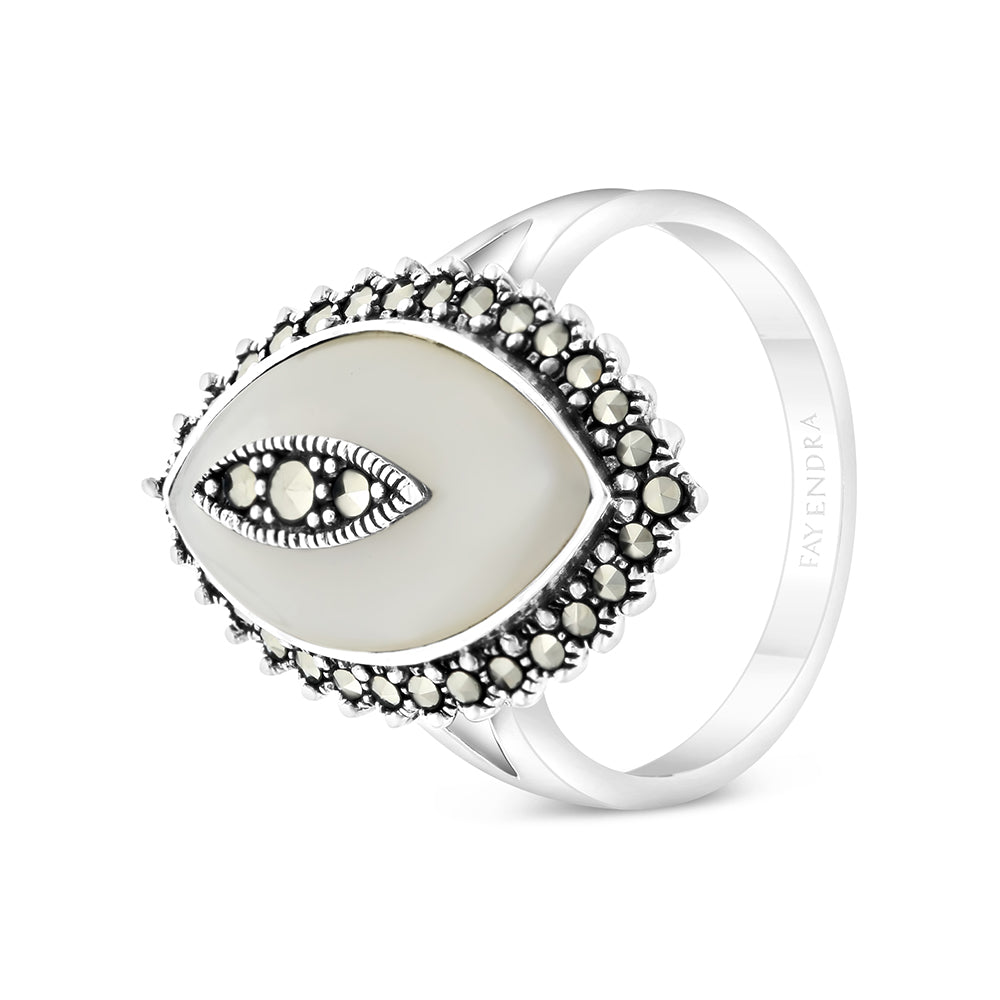 Sterling Silver 925 Ring Embedded With Natural White Shell And Marcasite Stones