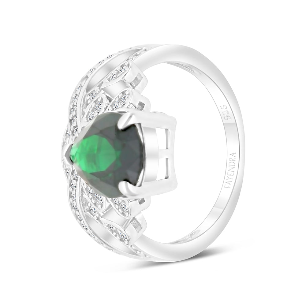 Total weight: 4.6gThe elegant craftsmanship of this ring and high attention to detail make it something of a true beauty. The ring is specialized for its wavy lines that sparkle gramoulsly with white pave, and with a separate pear-shaped emerald zircon embellishment which hangs beneath. This ring was made to show off, and present your high-end taste.