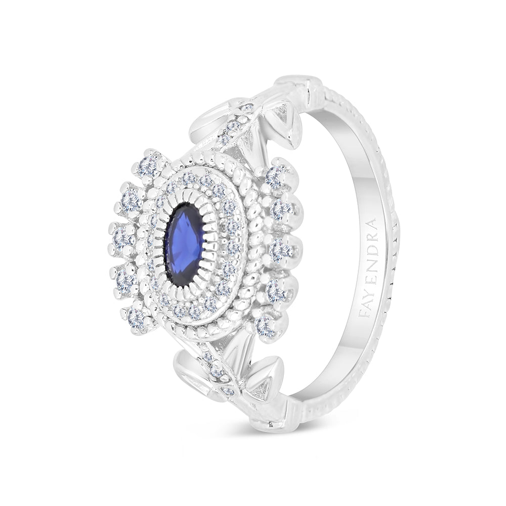 Sterling Silver 925 Ring Rhodium Plated Embedded With Sapphire Corundum And White CZ