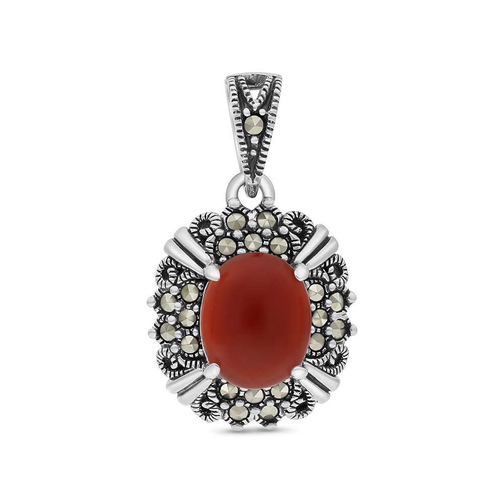 Sterling Silver 925 Pendant Embedded With Natural Aqiq And Marcasite Stones