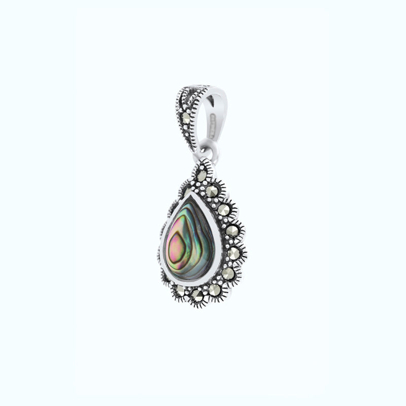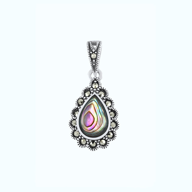 Total weight: 3.4gTo enhance the allure of this classic pendant, delicate Marcasite stones are intricately embedded around the blue shell stone. The striking contrast between the shimmering Marcasite and the deep, mysterious beauty of the natural shell creates a mesmerizing visual effect that will surely turn heads and spark conversations.