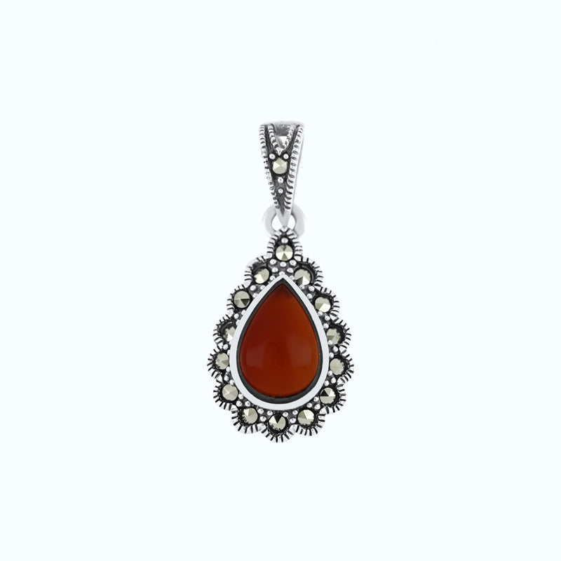 Total weight: 3.4gTo enhance the allure of this classic pendant, delicate Marcasite stones are intricately embedded around the red agate stone. The striking contrast between the shimmering Marcasite and the deep, mysterious beauty of the Agate creates a mesmerizing visual effect that will surely turn heads and spark conversations.
