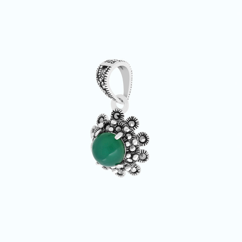 Total weight: 2.4gNo doubt flowers in jewelry are a very important element, not only for their beauty but for what they represent, Fayendra uses flowers widely in their collection including this 925 sterling silver pendant adorned with green agate at its center surrounded with marcasite stones arranged in the shape of petals.