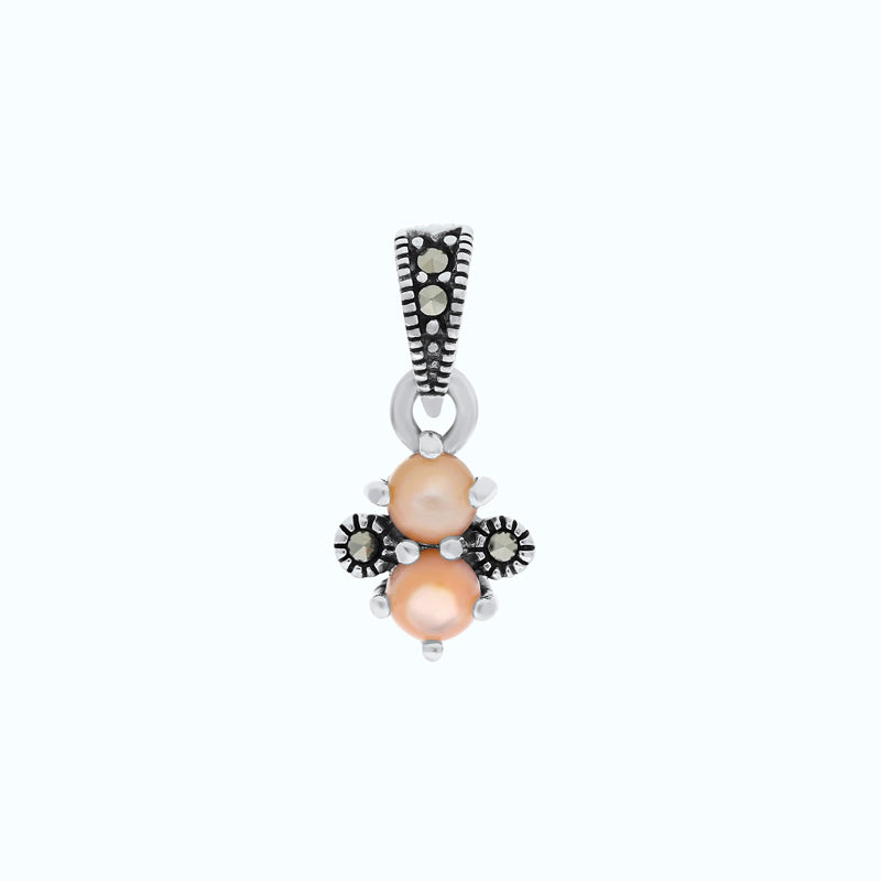 Total weight: 1.8gUnique and elegant pendant from Fayendra's classic collection, adorned with two natural pink shell stones and with shiny marcasite. Wear it alone or pair it with a similar earring and ring.