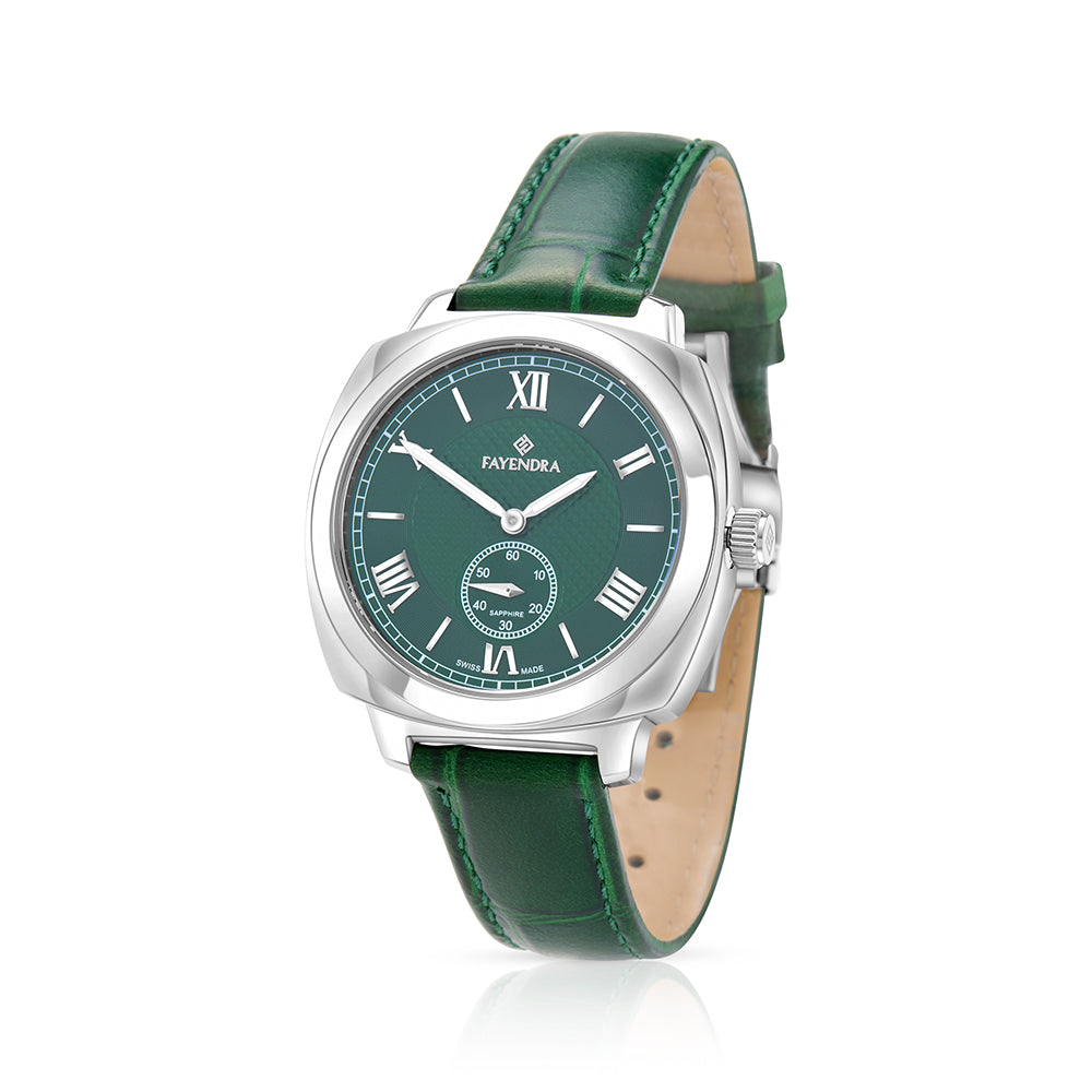 Enhance your confidence and distinction with the men's timepiece by Fayendra, crafted from L316 stainless steel and polished in a silver finish. The watch's modern appearance is complemented by the green leather strap, which gives a classic, exquisite touch. It features a green dial with silver markings, Roman numerals that showcase its elegance, and a circle that represents the time's minutes. This watch balances practical durability with classic elegance, protected by a sapphire crystal that is resistant to water, scratches, and shocks. Every aspect of this watch combines sophistication and strength. Don't miss up the opportunity to make it yours !