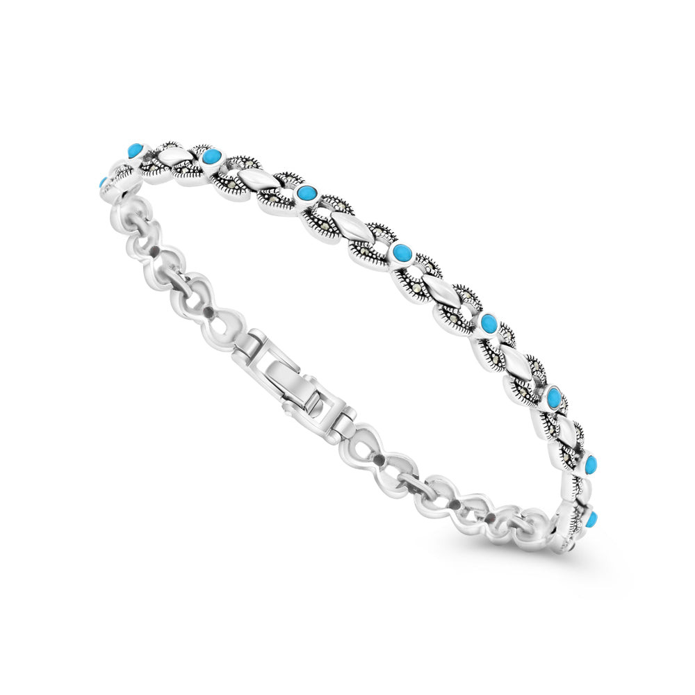 Total weight: 15gYou glow differently when you love your jewels! Enjoy Fayendra's unique tennis bracelets, crafted from 925 sterling silver and adorned with natural processed turquoise stones and shiny marcasite. The elegant bracelet features a foldover clasp making it easy to wear.