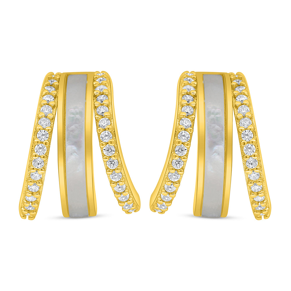 Total Weight: 2.2gAdorn your look with renewed elegance with these exquisite Fayendra earrings, crafted from pure 925 sterling silver and plated with gold for a long-lasting shine. The design features sleek, flowing lines centered by a strip of natural white mother-of-pearl that radiates a soft, refined glow, flanked on each side by luxurious white zircon stones in a brilliant cut. A creation that blends sophistication and luxury, giving you a piece perfect for every elegant occasion. Own it now!