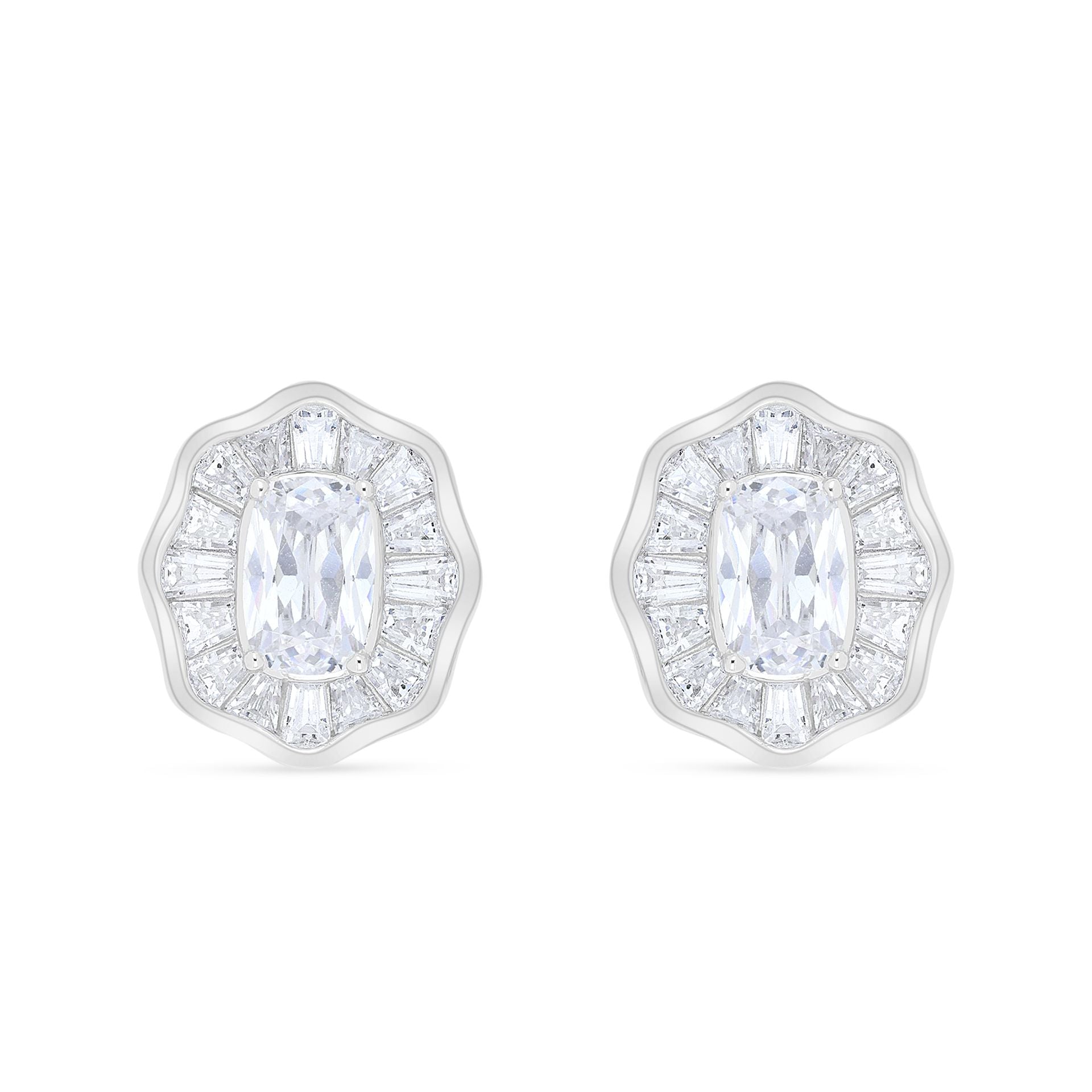 Shine with refined purity in Fayendra earrings crafted from 925 sterling silver and finished with luminous rhodium plating for lasting brilliance and protection, featuring a central white zircon in an elegant cushion-radiant cut that captures light with diamond-like clarity. Surrounding it is a meticulously arranged halo of baguette-cut white zircon stones set in a radiant pattern that creates depth and layered sparkle, while the softly contoured outer frame enhances the feminine silhouette with a timeless yet modern aesthetic. A sophisticated pair designed to elevate your presence with graceful brilliance for every occasion. Shop now and glow with irresistible radiance!