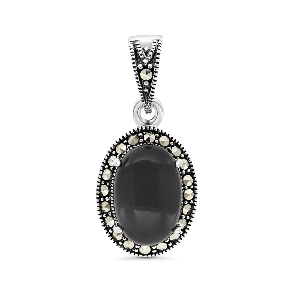 Sterling Silver 925 Pendant Embedded With Natural Black Agate And Marcasite Stones