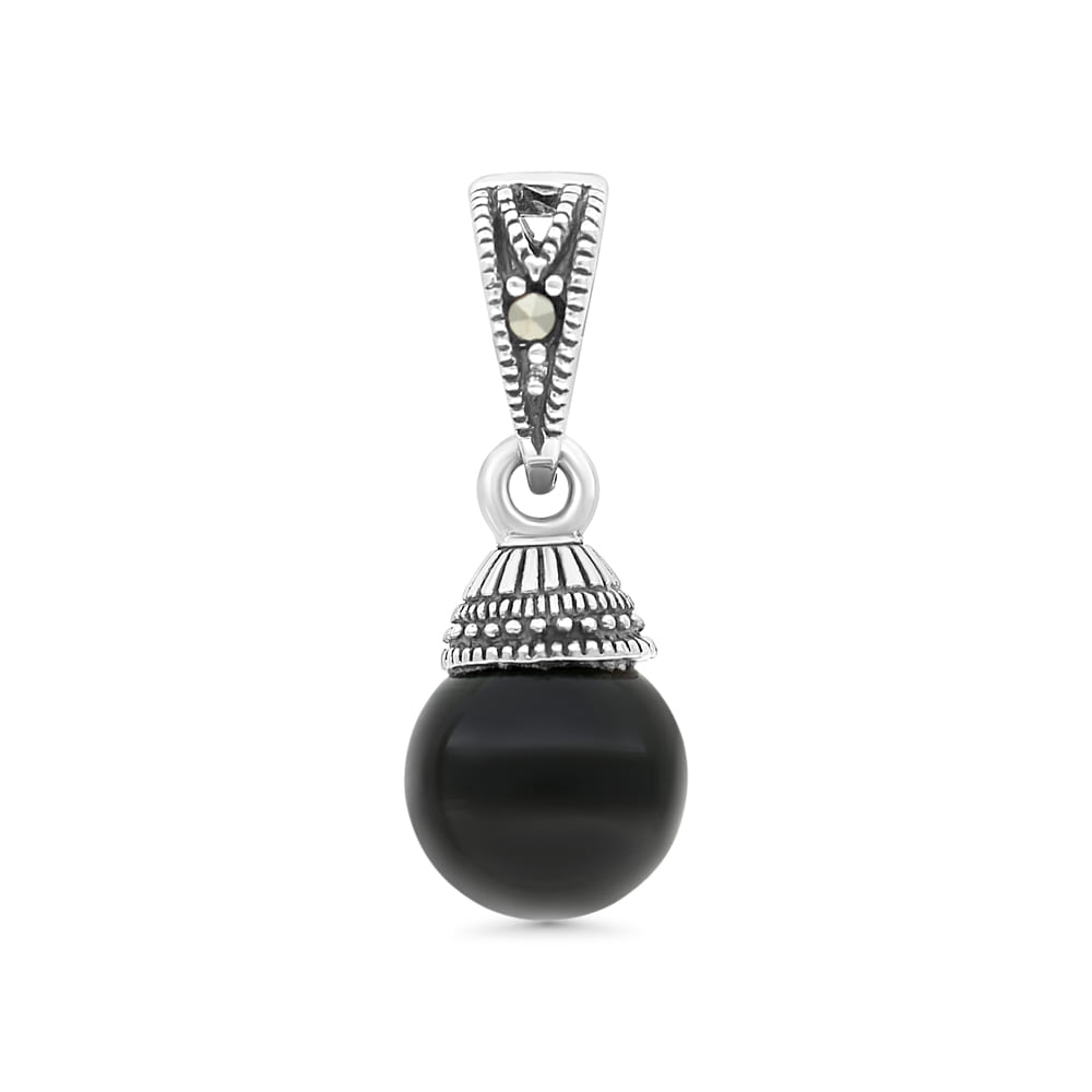Sterling Silver 925 Pendant Embedded With Natural Black Agate And Marcasite Stones