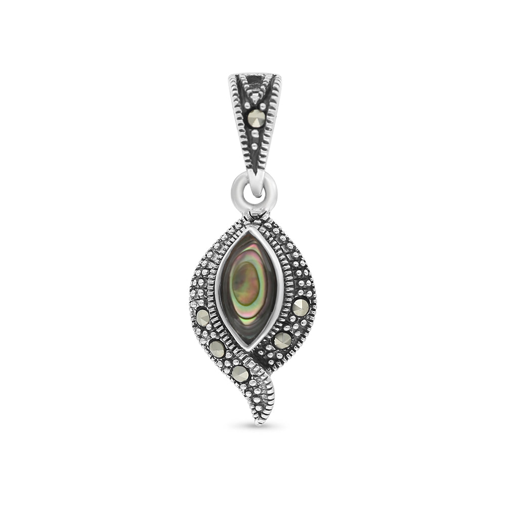 Total weight: 1.9gWhether you're getting ready for a big occasion or looking to upgrade your regular style, Our Silver Classic Pendant, embellished with marcasite and natural blue shell stone, is the ideal accessory for adding classic elegance to your look.It's a statement of timeless taste and a tribute to the intrinsic beauty of the natural world, making it a beloved addition to your jewelry collection. With this outstanding pendant, you may enhance your look and enjoy the attraction of classic elegance.