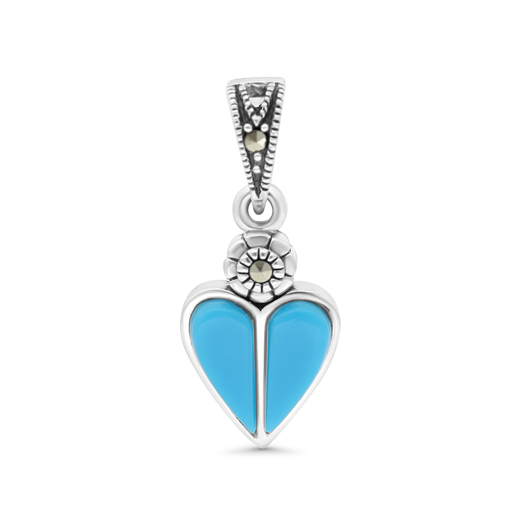 Total weight: 2.7gDainty 925 sterling silver pendant from Fayendra's classic collection. In a romantic design, two turquoise stones meet together to form a heart topped with a flower made up of shiny marcasite stones and dangling from a marcasite embellished setting. Gift it with matching earrings to the one who completes you as a way to show your love.