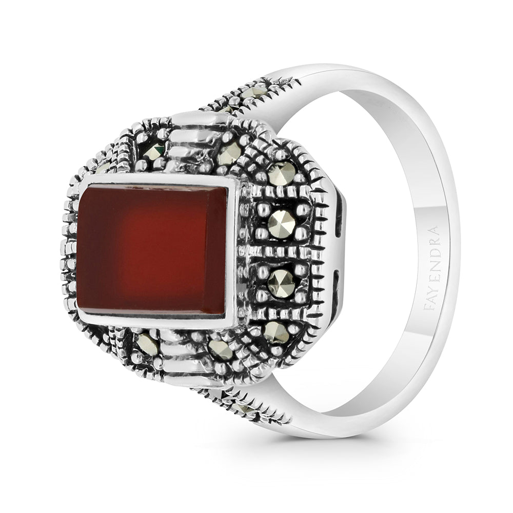 Total weight: 6gA classic ring, one of our most luxurious and sophisticated designs, inlaid with a natural baguette-cut agate stone and charming marcasite stones. To shine with it on your occasions.