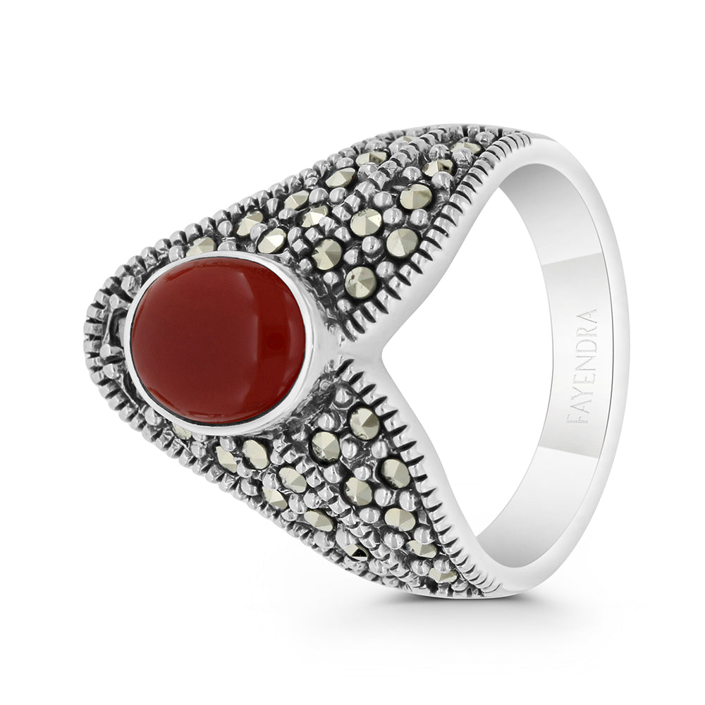 Total weight: 6gA classic ring distinguished by its exceptional cut, made of pure 925 sterling silver and inlaid with natural agate and marcasite stones, with their amazing shine and luster.