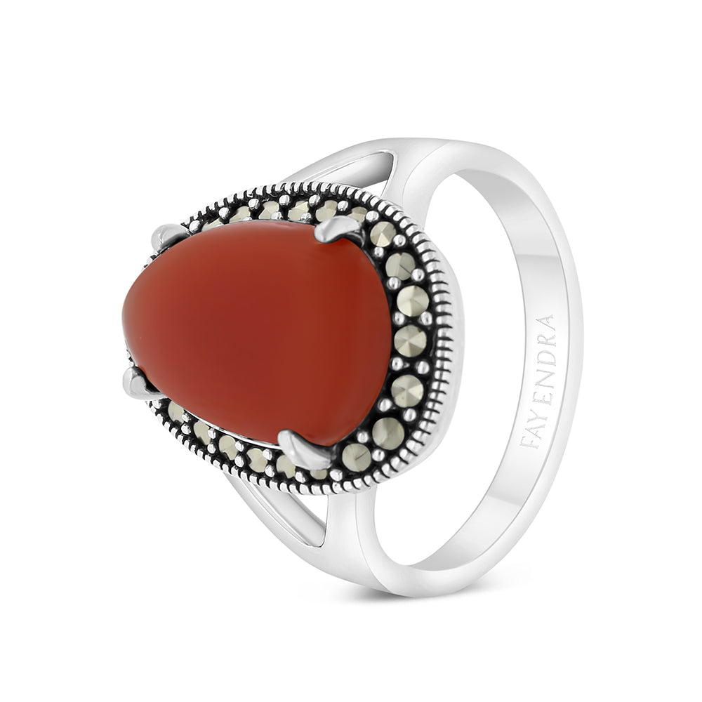Total weight: 5gهذا الخاتم مخصص لمن تحب المجوهرات الكلاسيكية الجميلة والأنيقة في حياتك. مزين بحجر عقيق أحمر طبيعي جميل وبأحجار ماركاسيت لامعة وعالية الجودة.