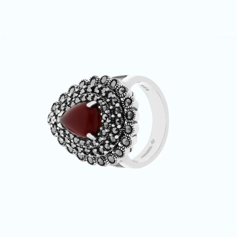 Total weight: 10gTo enhance the allure of this classic ring, delicate Marcasite stones are intricately embedded around the red agate stone.The striking contrast between the shimmering Marcasite and the deep, mysterious beauty of the natural agate creates a mesmerizing visual effect that will surely turn heads and spark conversations.