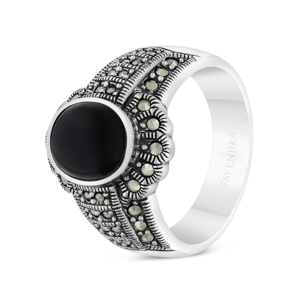 Sterling Silver 925 Ring Embedded With Natural Black Agate And Marcasite Stones