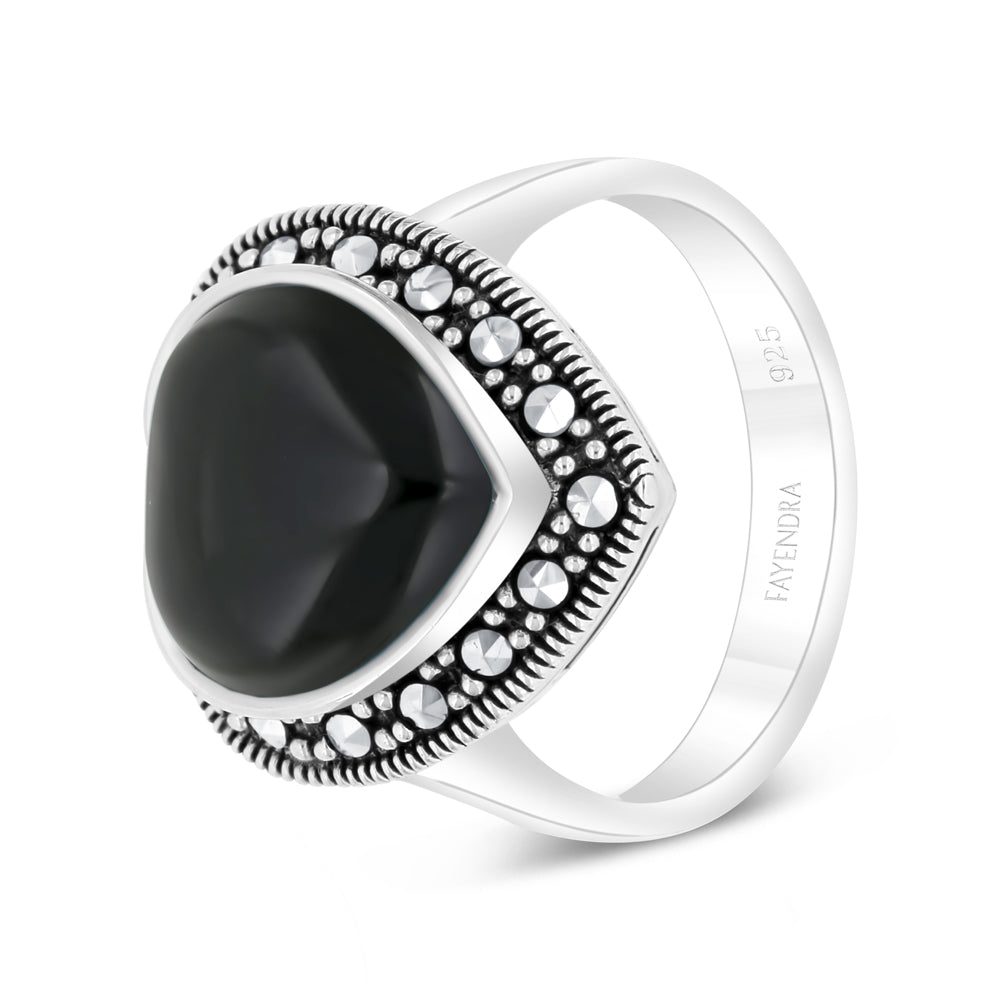 Total weight: 5.7gA classic ring with a contemporary twist, made of 925 sterling silver and set with natural onyx stone traced with marcasite stones. A sweet and lovely gift for yourself or someone you care about.