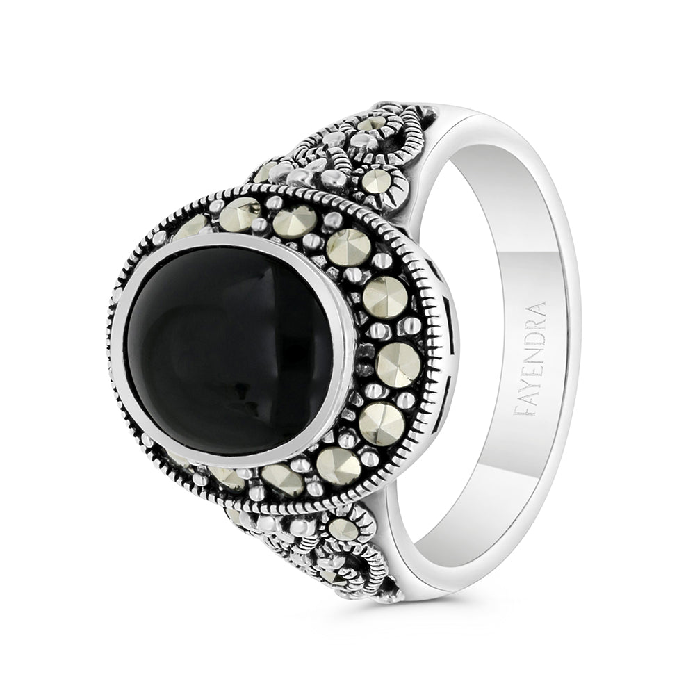 Sterling Silver 925 Ring Embedded With Natural Black Agate And Marcasite Stones
