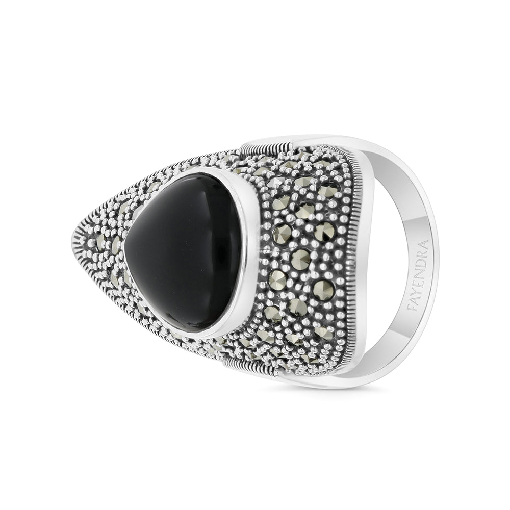 Total weight: 11.69gExpress your unique taste, and your love for quality and classics, with this Fayendra ring of sterling silver, inlaid with marcasite stones scattered all over its metal and a natural onyx stone in teardrop cut at its center. Coordinate it with your favorite outfit and get a striking look