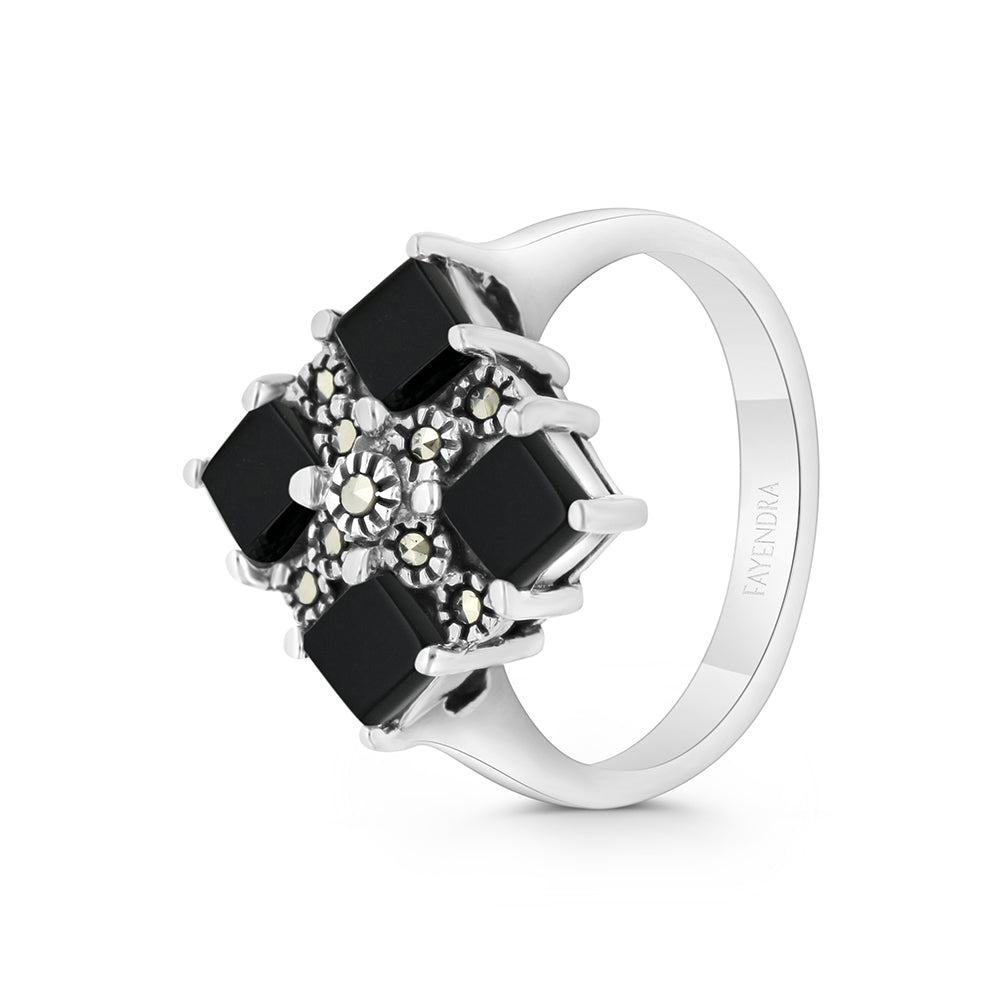 Sterling Silver 925 Ring Embedded With Natural Black Agate And Marcasite Stones