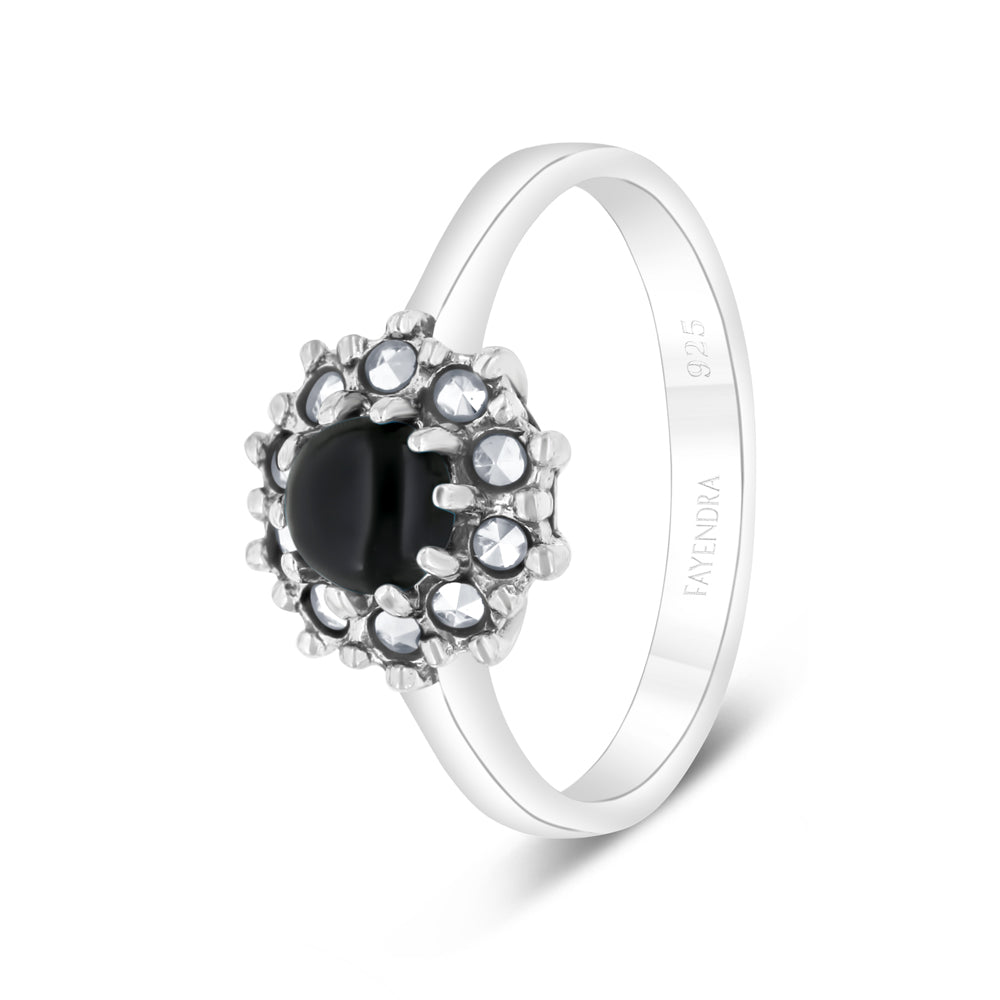 Sterling Silver 925 Ring Embedded With Natural Black Agate And Marcasite Stones