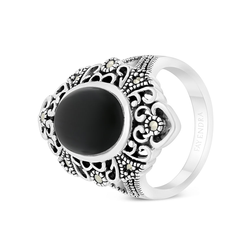 Sterling Silver 925 Ring Embedded With Natural Black Agate And Marcasite Stones