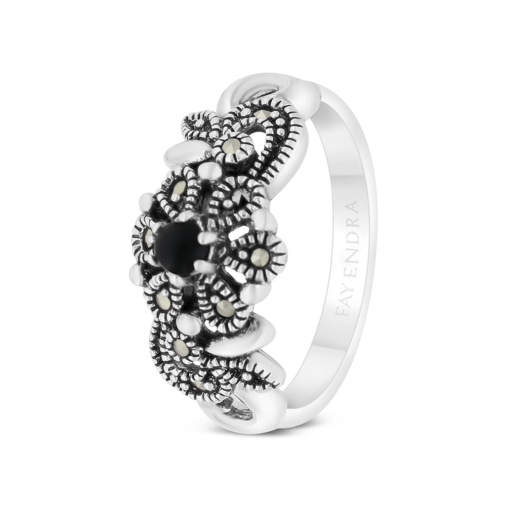 Sterling Silver 925 Ring Embedded With Natural Black Agate And Marcasite Stones