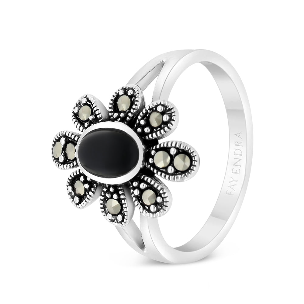 Total weight: 2.7gزهرة جذابة ذات لون ساحر هنا لتعكس شخصيتك غير العادية. خاتم من الفضة الإسترليني مزين بحجر الأونيكس الطبيعي والماركاسيت ، جاهز ليكون قطعة مجوهراتك المفضلة.