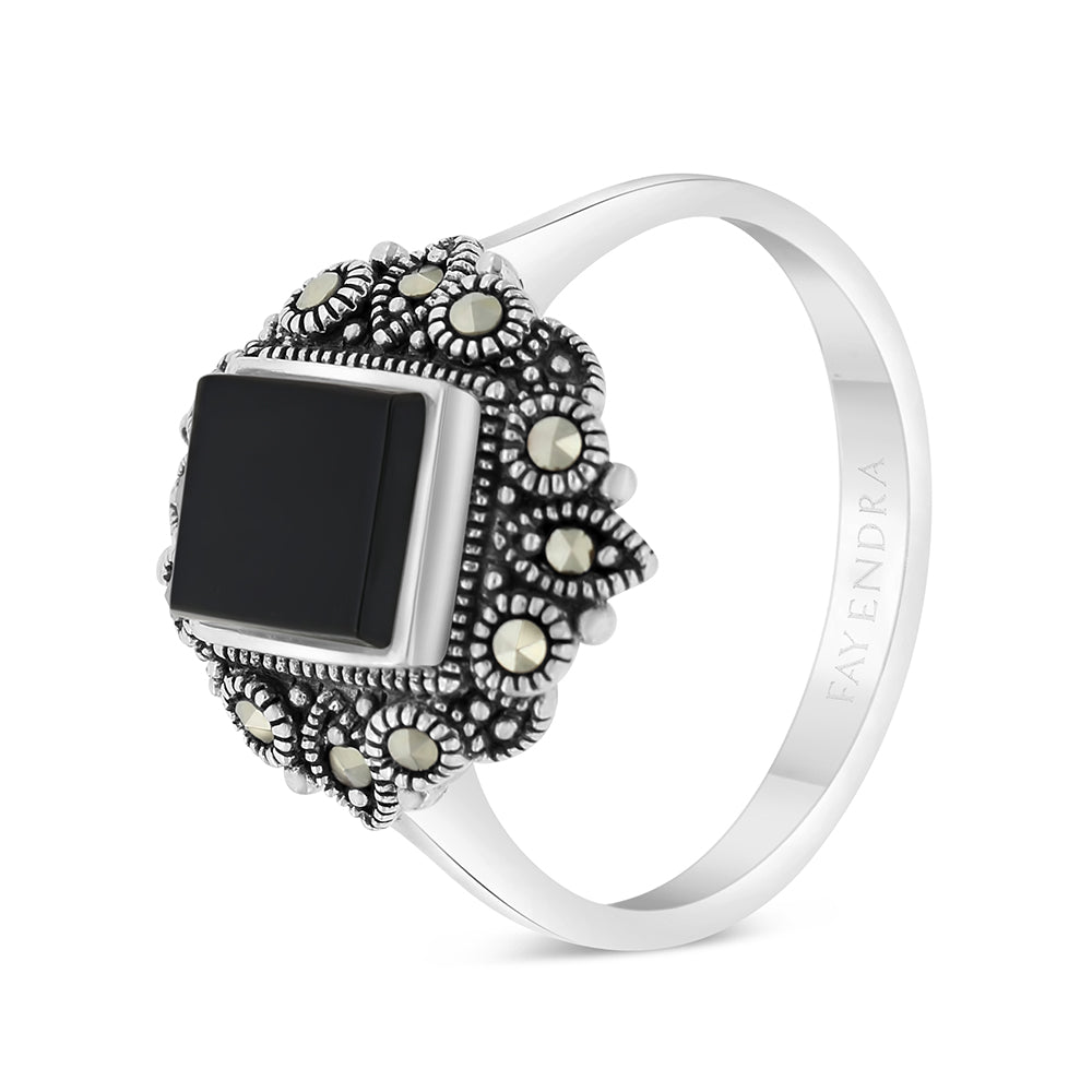 Sterling Silver 925 Ring Embedded With Natural Black Agate And Marcasite Stones