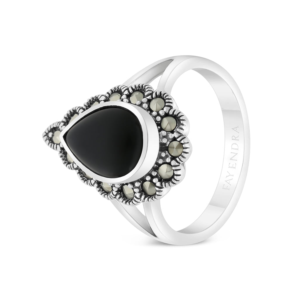 Sterling Silver 925 Ring Embedded With Natural Black Agate And Marcasite Stones