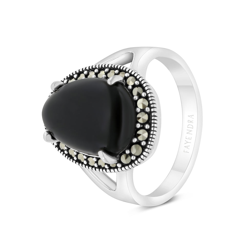 Sterling Silver 925 Ring Embedded With Natural Black Agate And Marcasite Stones