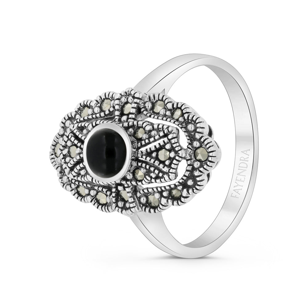 Total weight: 4.84gElegant 925 sterling silver ring adorned with a natural onyx stone in the round cut set on its center and studded with clear marcasite stones specialized for their pure shine. This sophisticated ring is part of Fayendra's classic collection.