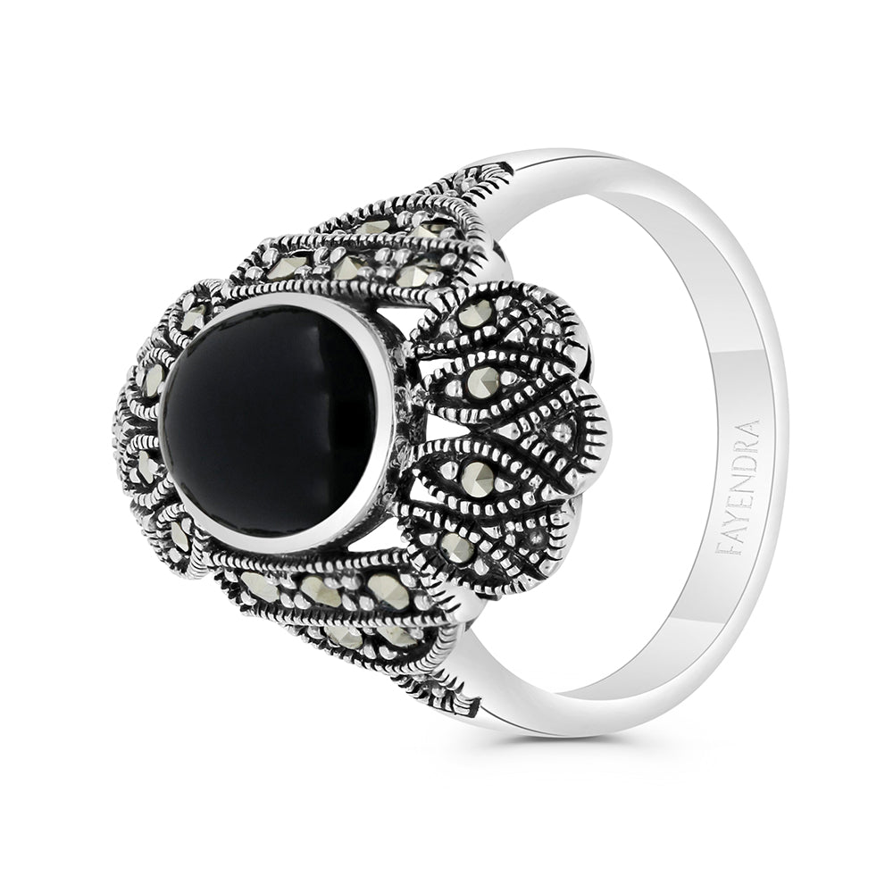 Sterling Silver 925 Ring Embedded With Natural Black Agate And Marcasite Stones