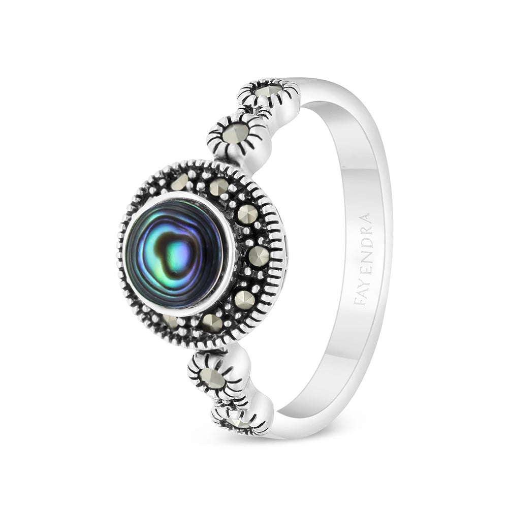 Total weight: 3.8gسيكون هذا الخاتم المذهل المزخرف بالماركاسيت هدية رائعة لوالدتك ، هذا الخاتم هو إضافة كلاسيكية راقية لأي صندوق مجوهرات. مزين بحجر صدف أزرق طبيعي في وسطه بقصة دائرية ومصنوع من الفضة الإسترليني عيار 925.