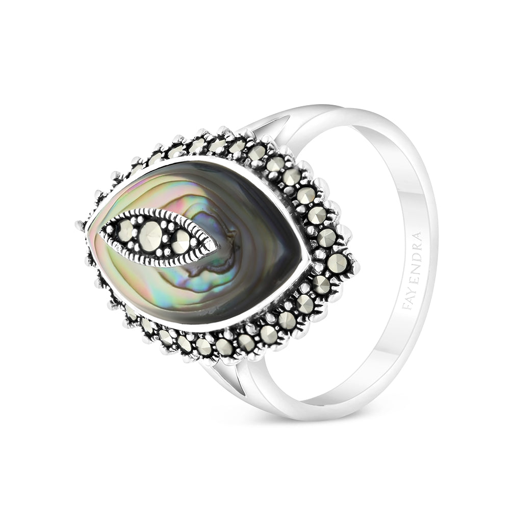 Total weight: 4.5gReady to elevate any look, this alluring ring will make a classic addition to your everyday wardrobe. Showcasing a radiant natural blue shell stone set in a marcasite embellished frame.