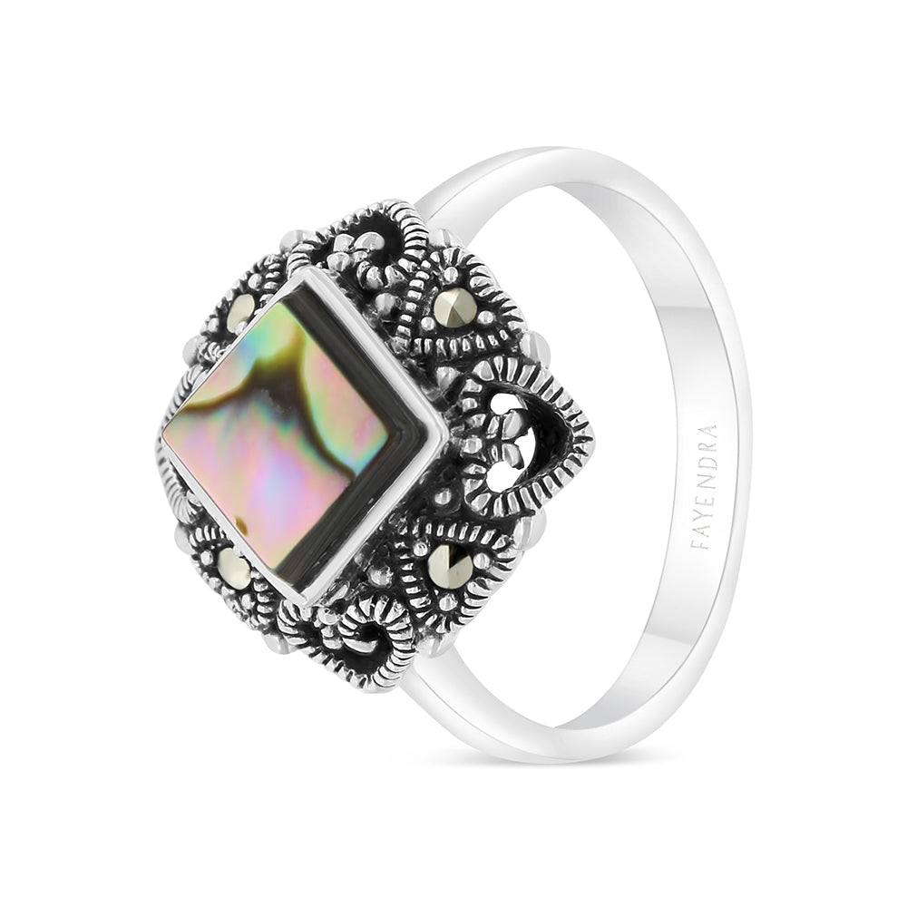 Sterling Silver 925 Ring Embedded With Natural Blue Shell And Marcasite Stones