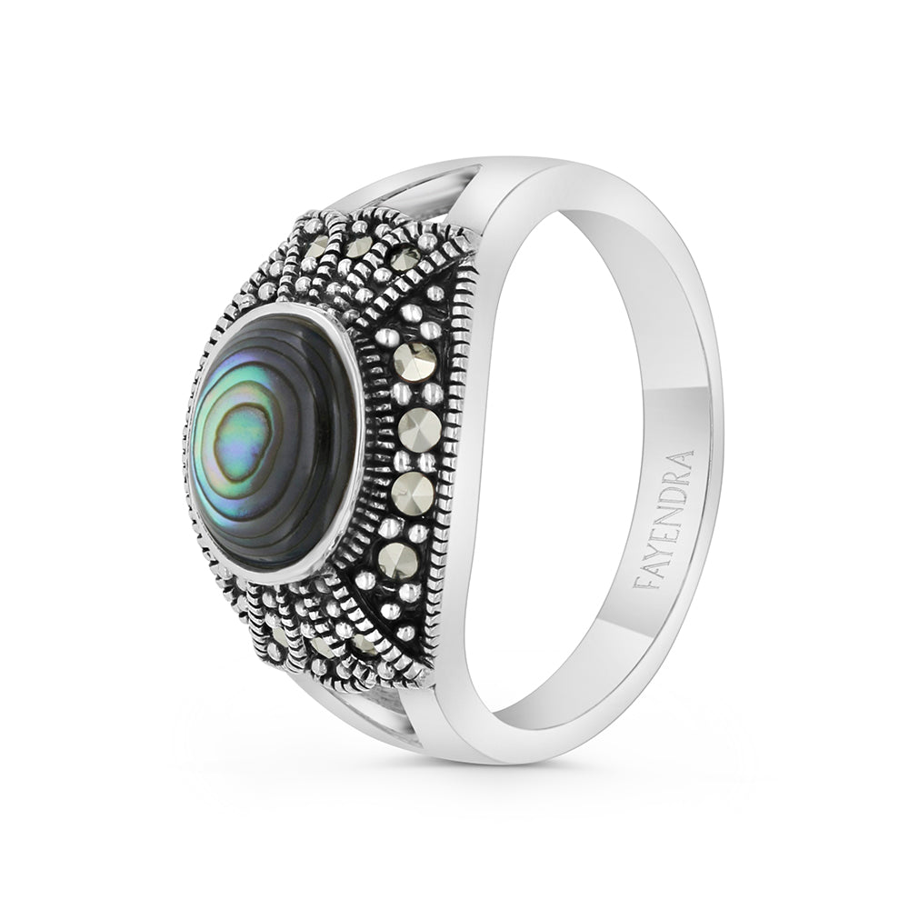 Total weight: 4.7g925 sterling silver ring for women, distinguished by its classic and elegant luster derived from pure marcasite stones, and the high beauty of the natural pawa shell stone with its oval cut. Add it to your collection and enjoy the sophistication of our silver jewelry.