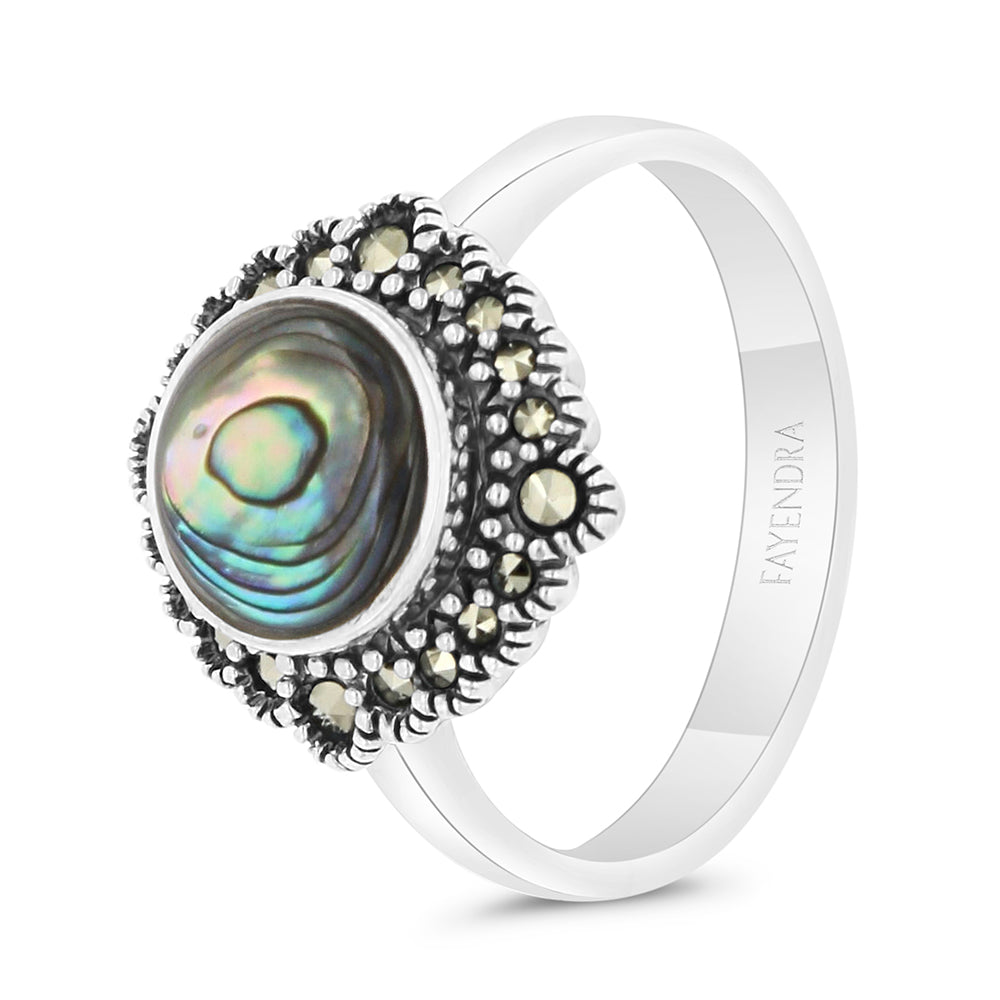 Whether you're preparing for a special event or seeking to elevate your everyday look, our Silver Classic Ring adorned with marcasite and natural blue shell stone is the perfect accessory to add timeless elegance to your style.It's a symbol of enduring taste and a tribute to the natural world's inherent beauty, making it a treasured addition to your jewelry collection. Elevate your appearance and embrace the allure of classic elegance with this exceptional Ring.