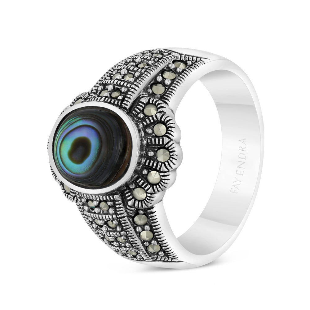 Sterling Silver 925 Ring Embedded With Natural Blue Shell And Marcasite Stones