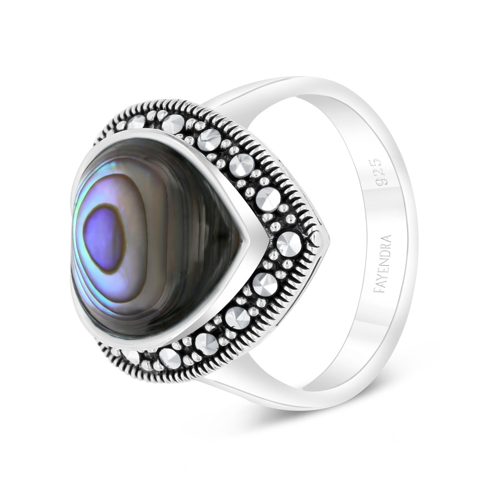 Total weight: 5.7gA classic ring with a contemporary twist, made of 925 sterling silver and set with natural blue shell stone traced with marcasite stones. A sweet and lovely gift for yourself or someone you care about.