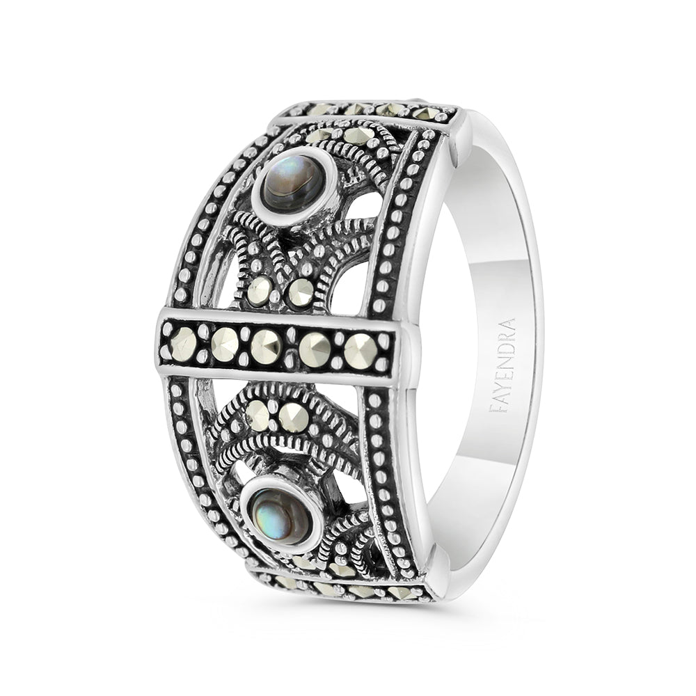 Sterling Silver 925 Ring Embedded With Natural Blue Shell And Marcasite Stones