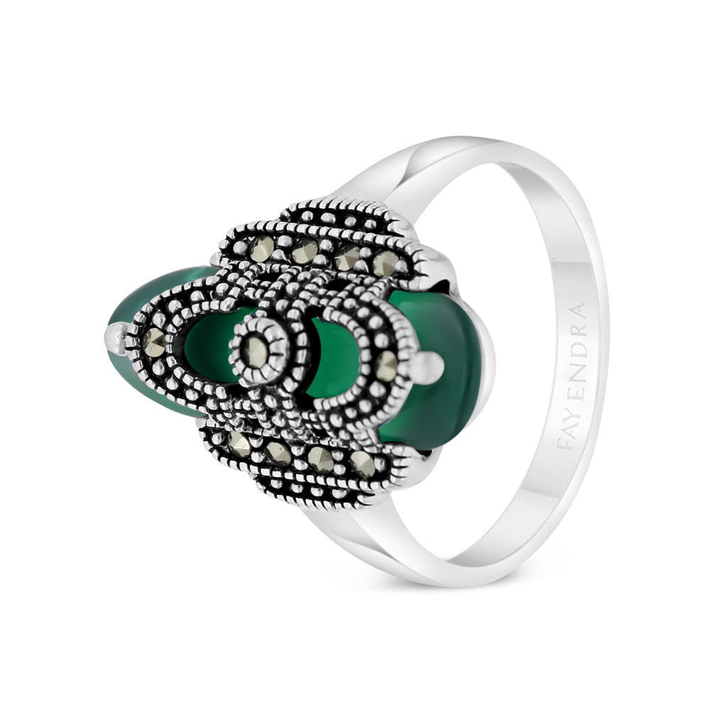 Sterling Silver 925 Ring Embedded With Natural Green Agate And Marcasite Stones