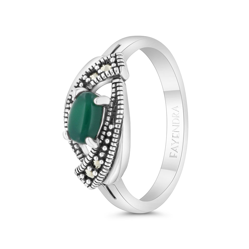 Sterling Silver 925 Ring Embedded With Natural Green Agate And Marcasite Stones