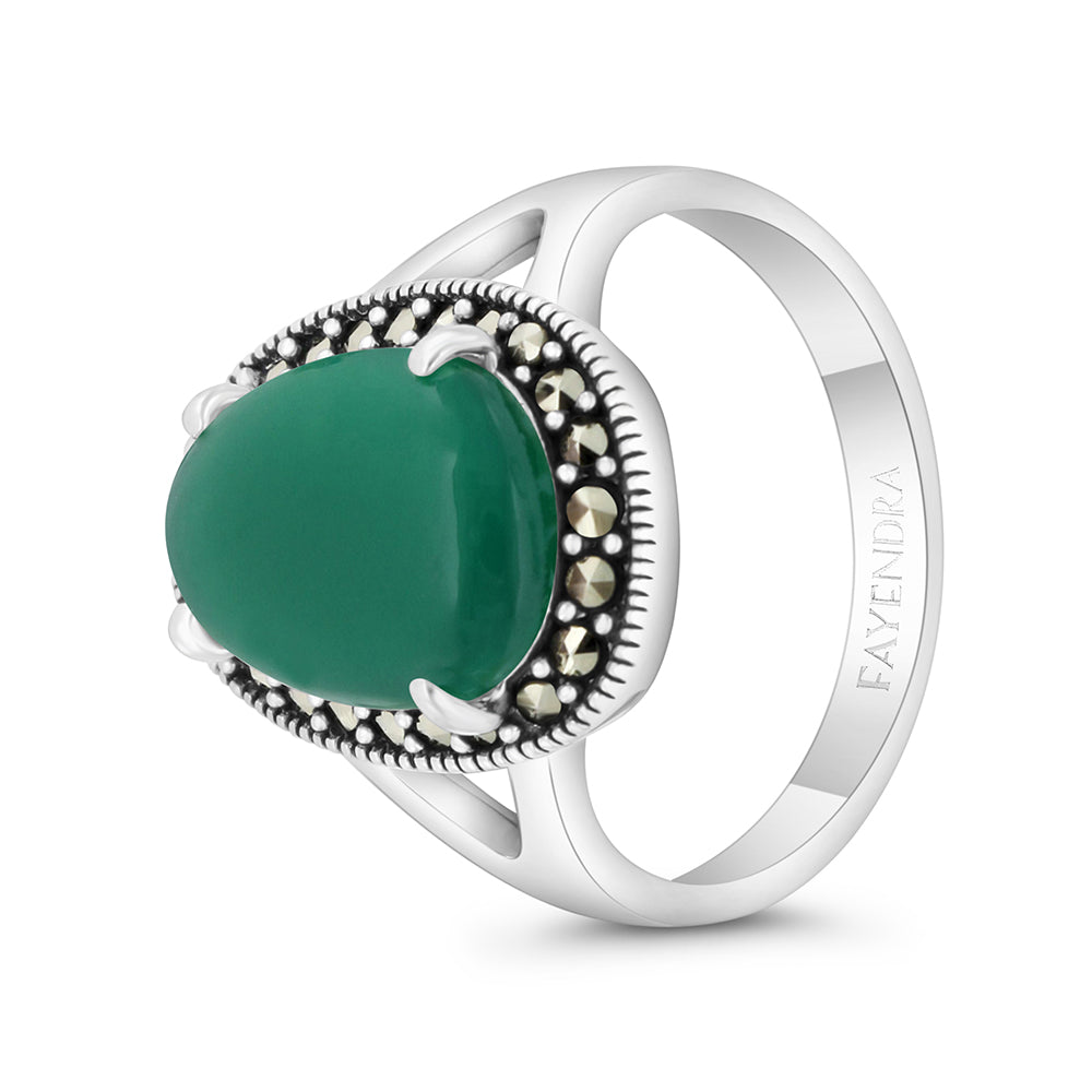 Sterling Silver 925 Ring Embedded With Natural Green Agate And Marcasite Stones