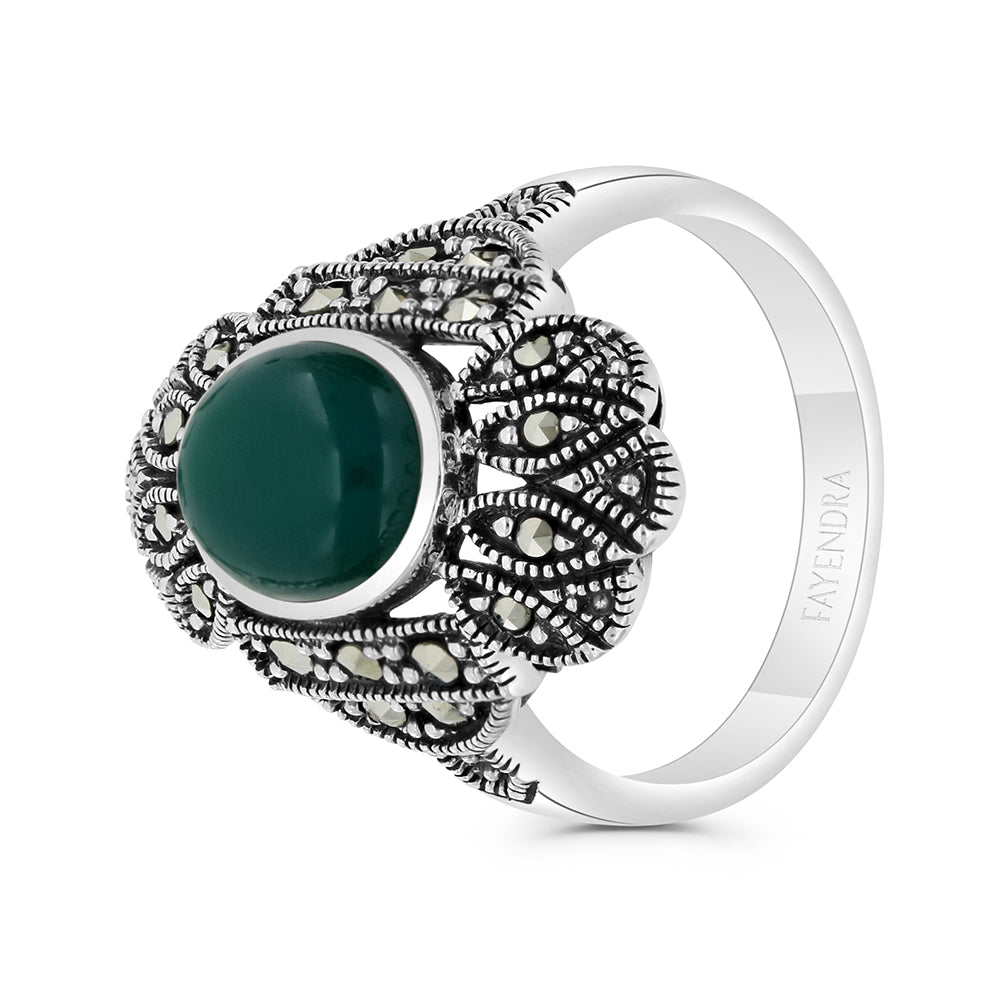 Sterling Silver 925 Ring Embedded With Natural Green Agate And Marcasite Stones