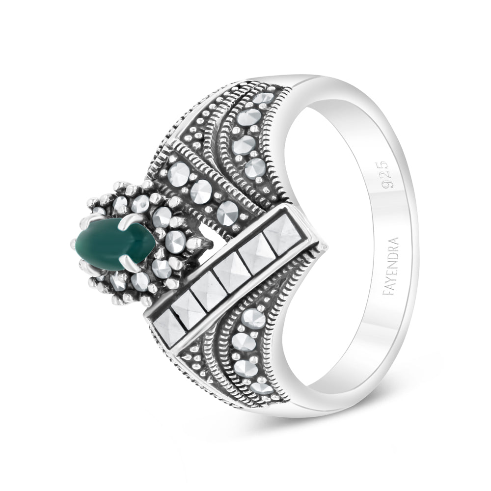 Sterling Silver 925 Ring Embedded With Natural Green Agate And Marcasite Stones