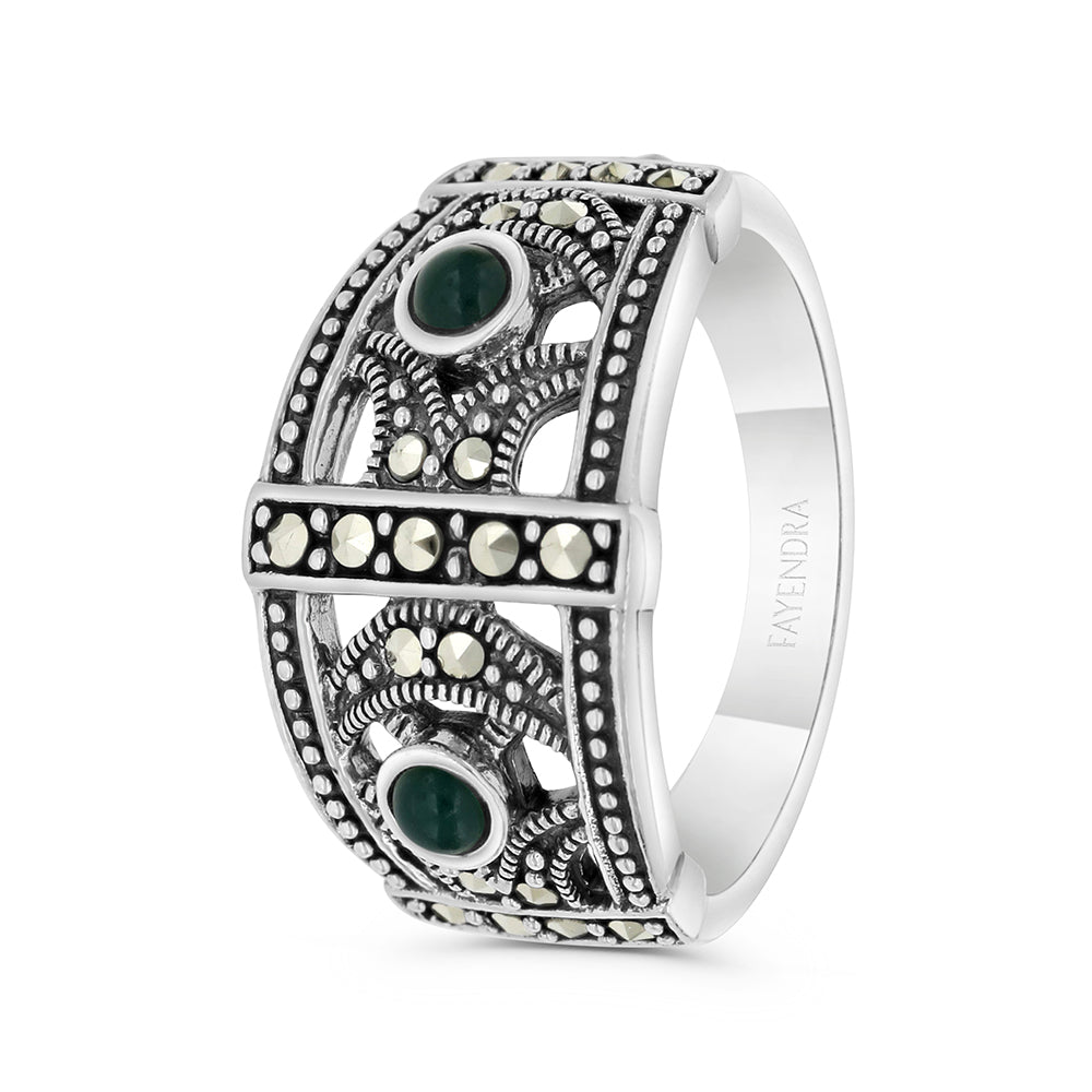 Sterling Silver 925 Ring Embedded With Natural Green Agate And Marcasite Stones