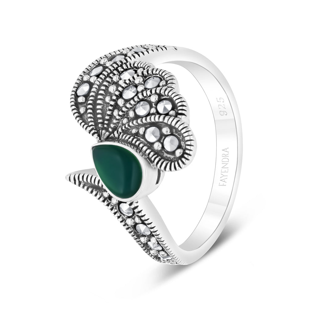 Total weight: 3.8gPeacocks are known for their special beauty, and they symbolize versatility, glamour, and luxury. Our 925 sterling silver fine ring is inspired by peacocks to reflect your love for beauty and sophistication. The silver ring is adorned with natural green agate stone and shiny pure marcasite. Own the whole set for luxurious jewels that will never fail you.