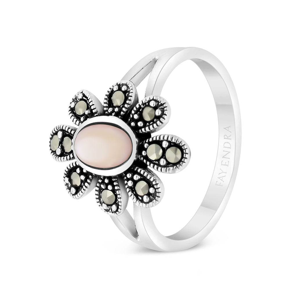 Sterling Silver 925 Ring Embedded With Natural Pink Shell And Marcasite Stones